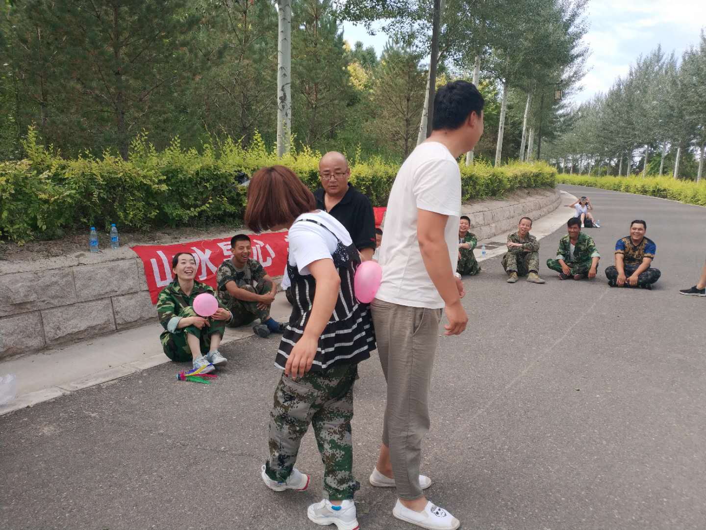 早上8點(diǎn)到黃河樓后,我們對18名新學(xué)員進(jìn)行了分組,將隊(duì)員分成兩支隊(duì)伍,由隊(duì)長組織進(jìn)行游戲。在隊(duì)長的帶領(lǐng)下,各隊(duì)隊(duì)員精誠合作,相互支持,先后進(jìn)行了“跳繩比賽”、“個人跳繩比賽”、“斗牛比賽”“背對背運(yùn)氣球比賽”“拔河比賽”、“俯臥撐比賽”等拓展項(xiàng)目。