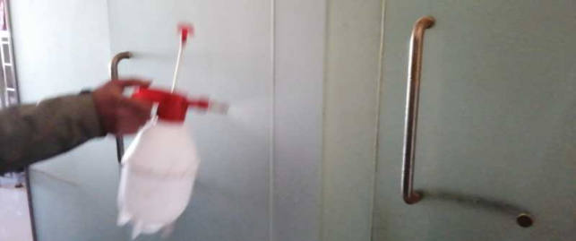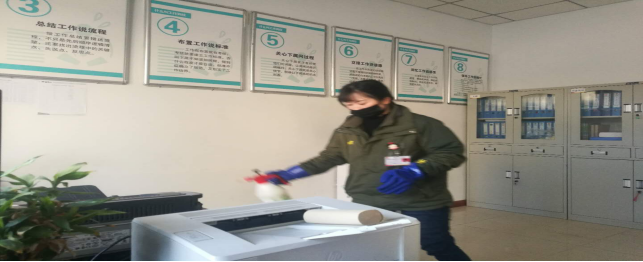 擦拭操作臺、門把手,進行衛(wèi)生消毒,工作的有條不紊。
