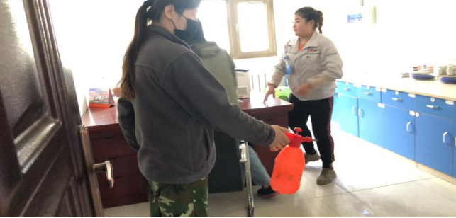 擦拭操作臺(tái)、門把手,工作的有條不紊。