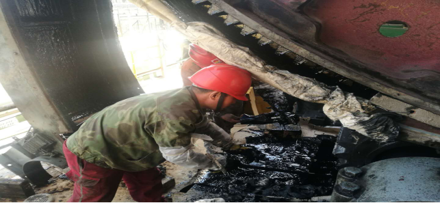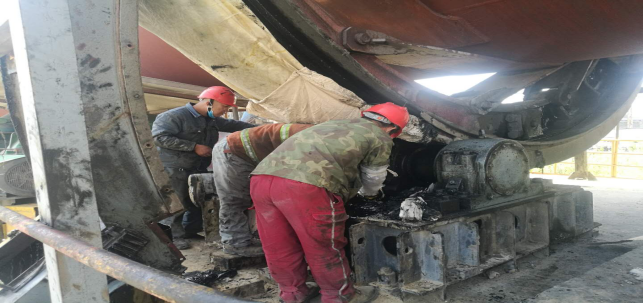 4月27日,此次回轉(zhuǎn)窯檢修已經(jīng)迎來(lái)了最后的沖刺階段。工作中最頻繁,最臟的,最累的工作任務(wù)莫過(guò)于回轉(zhuǎn)窯大齒輪更換機(jī)油及校正工作。