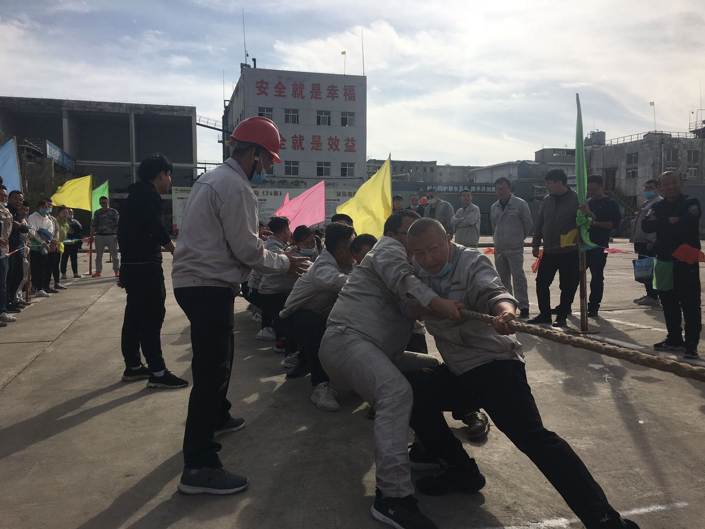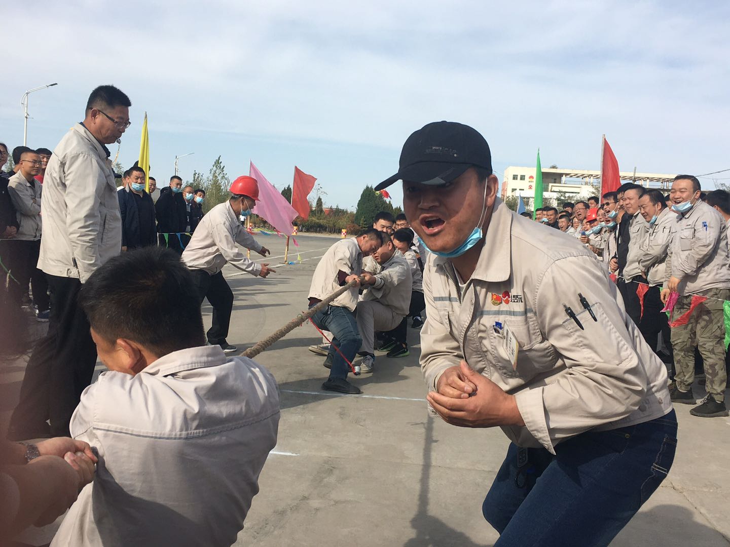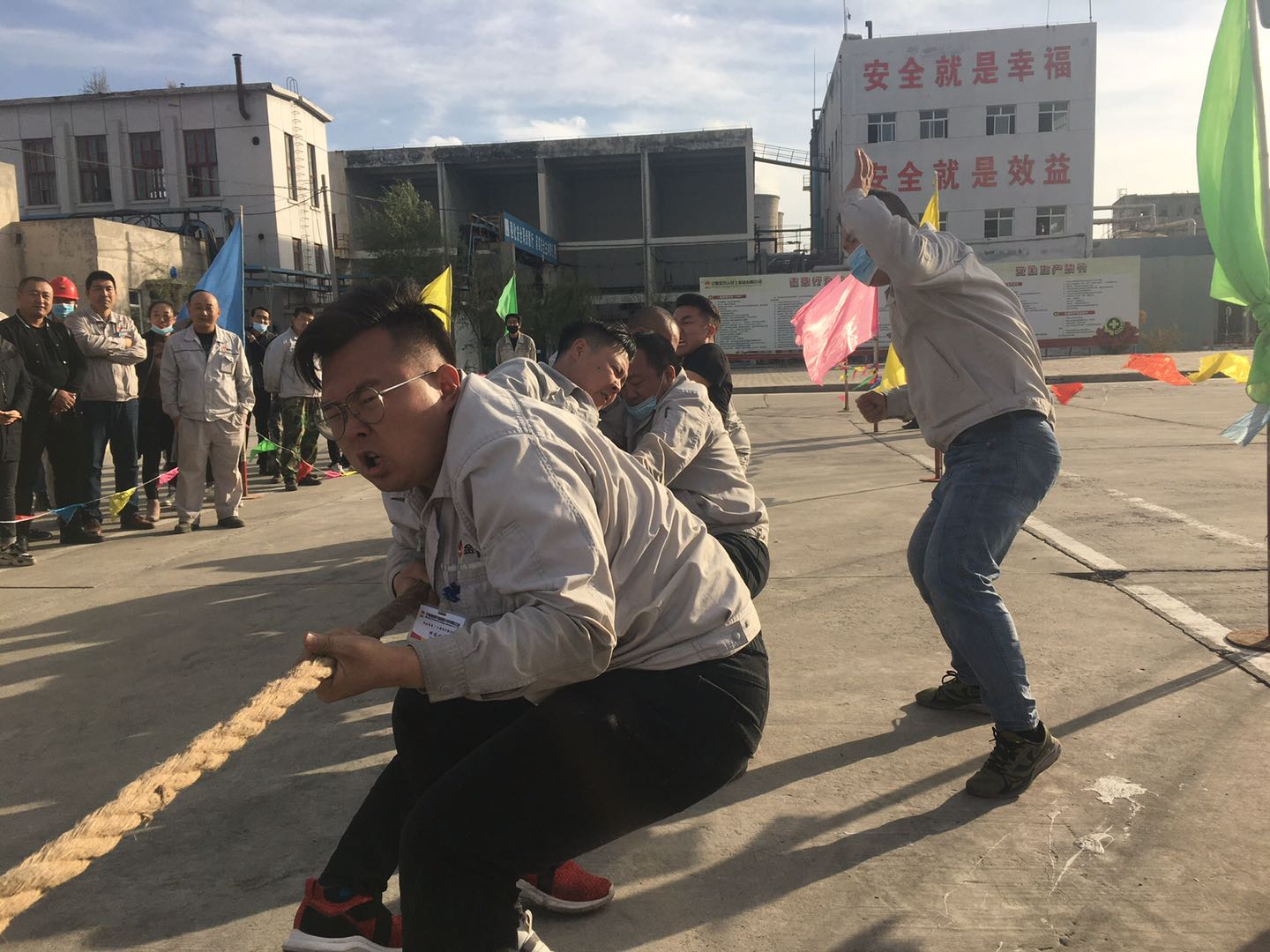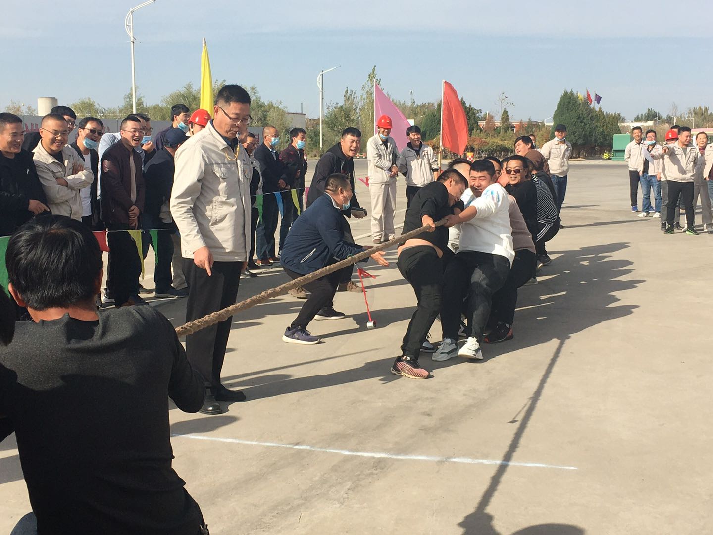 當(dāng)比賽的哨聲響起,只見參賽的隊(duì)員們緊握長(zhǎng)繩卯足勁拼命往后拉,有的同志臉憋得通紅卻絲毫不放松,有的“面部猙獰”使盡渾身解數(shù),還有的干脆閉上眼睛卯足了勁兒往后拉。女同志們更是不甘示弱,一個(gè)個(gè)咬緊牙關(guān),將巾幗不讓須眉的精神風(fēng)貌發(fā)揚(yáng)得淋漓盡致。未參賽的員工自發(fā)組成啦啦隊(duì)為比賽隊(duì)員吶喊加油。哨子聲、吶喊聲此起彼伏,給比賽增添了一抹亮色,每一聲吶喊都帶來(lái)一股力量,現(xiàn)場(chǎng)激烈的比賽將整個(gè)活動(dòng)推到了高潮。