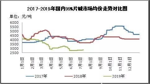 圖1 2017-2019年國(guó)內(nèi)99%片堿市場(chǎng)均價(jià)走勢(shì)對(duì)比圖