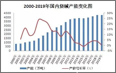 圖2 2000-2019年國(guó)內(nèi)燒堿產(chǎn)能變化圖