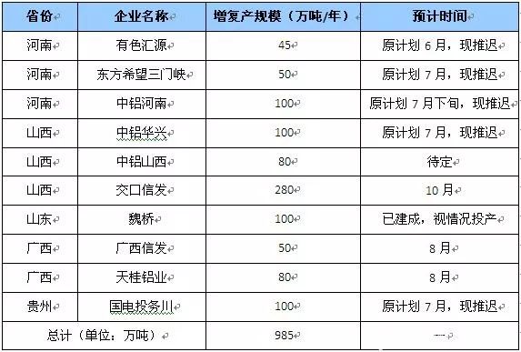 表1 2019年國(guó)內(nèi)氧化鋁增復(fù)產(chǎn)統(tǒng)計(jì)(數(shù)據(jù)來源:東證期貨)