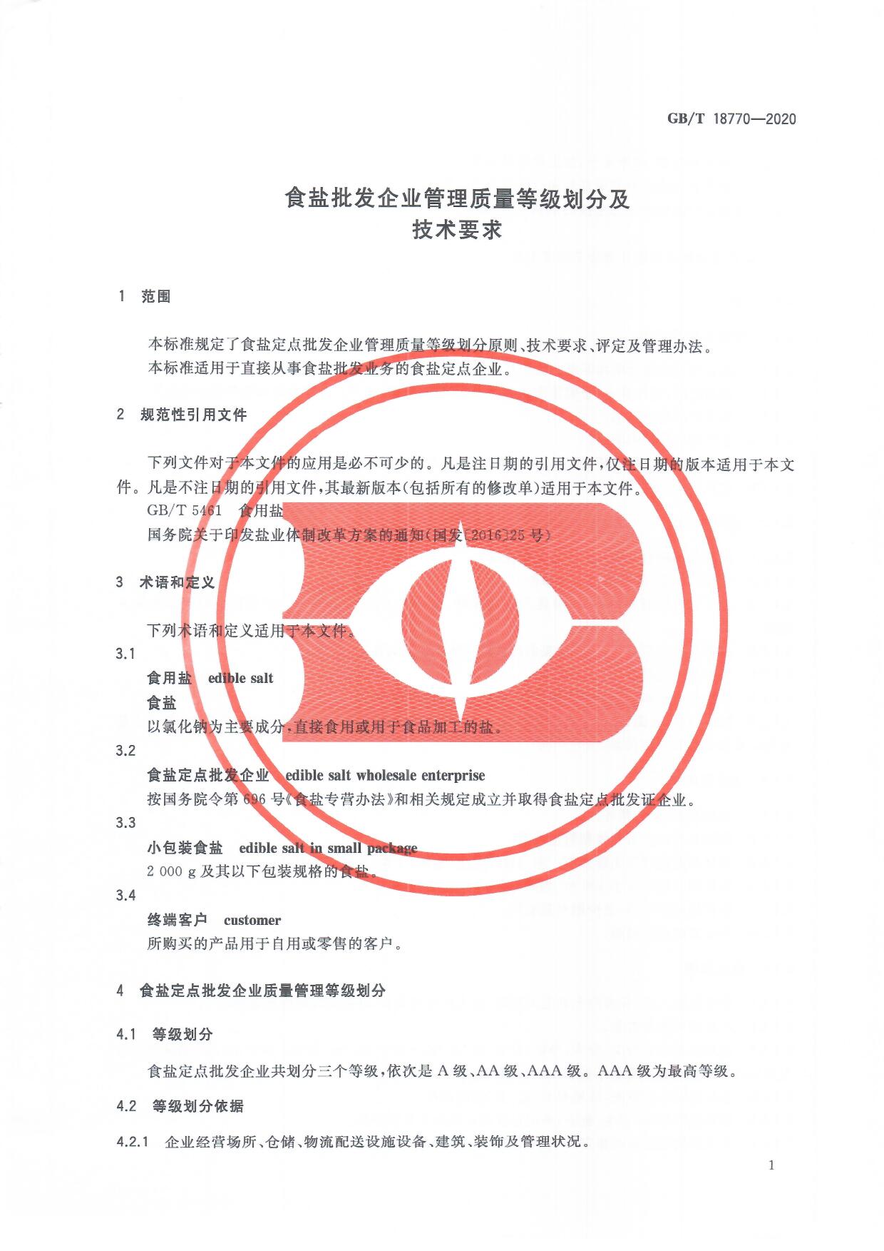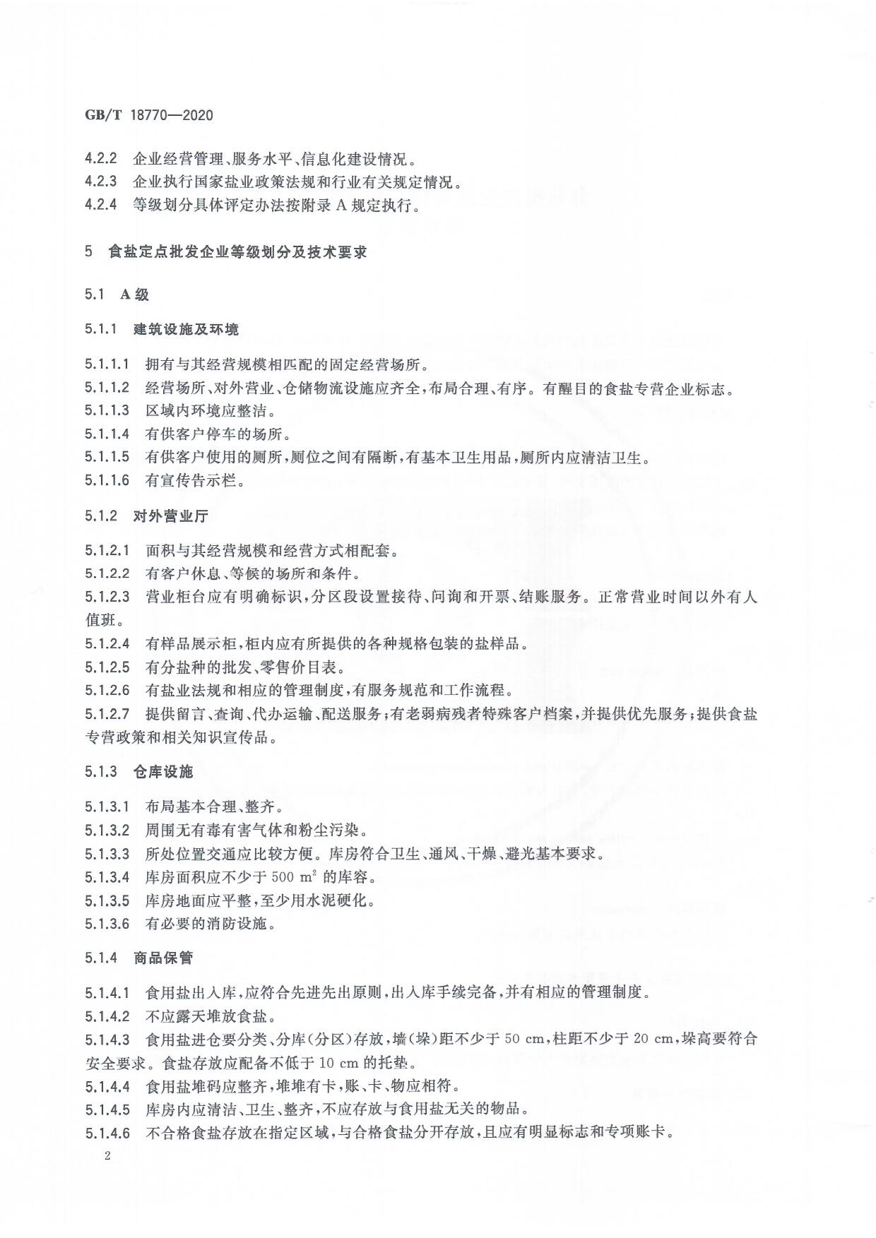 食鹽批發(fā)企業(yè)管理質(zhì)量等級劃分及技術(shù)要求(GB/T 18770-2020)