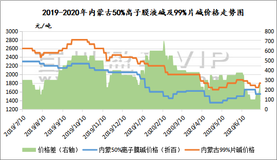 如上圖,可以明顯看出,從2019年至今,99%片堿與50%離子膜液堿折百價(jià)格差有不斷縮減趨勢(shì),這意味著片堿行業(yè)利潤(rùn)下滑,2020年上半年中國(guó)片堿市場(chǎng)價(jià)格大幅下滑,跌落至近十年的歷史低位。