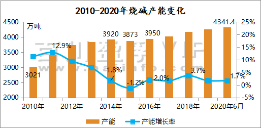 燒堿市場(chǎng)行情走勢(shì)與市場(chǎng)供需情況往往存在密切的聯(lián)系,而供應(yīng)方面的變化主要來(lái)自于產(chǎn)能的改變,今日我們百川從供應(yīng)角度分析2010-2020年燒堿產(chǎn)能變遷情況;2010-2015年中國(guó)燒堿處于飛速擴(kuò)展,供應(yīng)的激增導(dǎo)致產(chǎn)品價(jià)格偏低,2013年開(kāi)始廠家擴(kuò)產(chǎn)趨于理性,2015年中國(guó)燒堿產(chǎn)能增長(zhǎng)率為-1.2%。