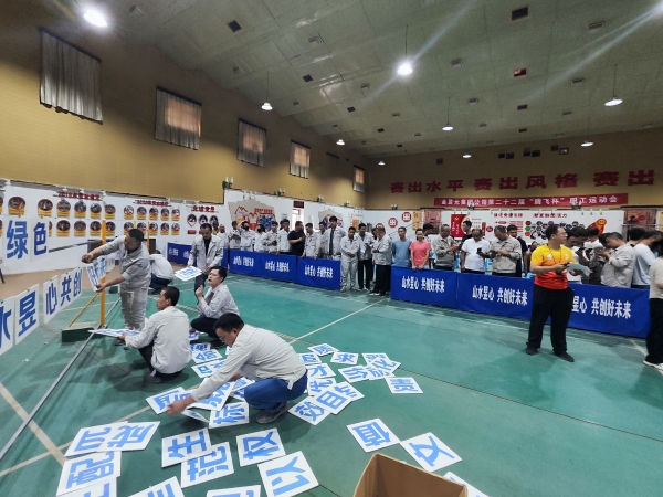 隨著裁判一聲令下,企業(yè)理念拼字比賽迎來激動人心的時刻。各參賽隊(duì)員不急不躁、有條不紊,大家集思廣益、默契配合,在最短時間內(nèi)準(zhǔn)確拼出“踐行綠色發(fā)展 留駐青山綠水”“山水昱心 共創(chuàng)好未來”“安全就是幸福 安全就是效益”等橫幅。